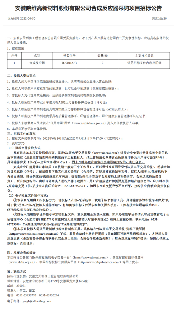 皖维高新材料股份有限公司合成反应器采购项目招标信息发布